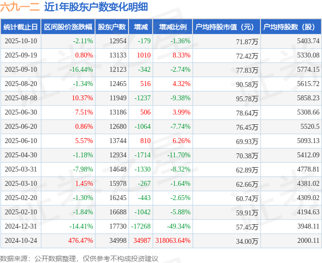 从股价来看,2025年9月19日至2025年10月10日,六九一二区间跌幅为2.11%,在此期间股东户数减少179.0户,减幅为1.36%。