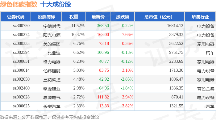 证券之星消息,10月16日,绿色低碳(399258)指数报收于4374.02点,涨0.53%,成交1214.58亿元,换手率2.23%。当日该指数成份股中,上涨的有13家,阳光电源以7.66%的涨幅领涨,下跌的有35家,金力永磁以5.24%的跌幅领跌。