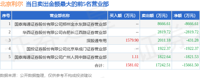 证券之星消息,沪深交易所2025年10月16日公布的交易公开信息显示,北京利尔(002392)因日跌幅偏离值达到7%的前5只证券登上龙虎榜。此次是近5个交易日内第1次上榜。
