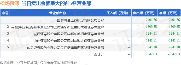 证券之星消息,沪深交易所2025年10月16日公布的交易公开信息显示,松炀资源(603863)因有价格涨跌幅限制的日收盘价格跌幅偏离值达到7%的前五只证券登上龙虎榜。此次是近5个交易日内第1次上榜。