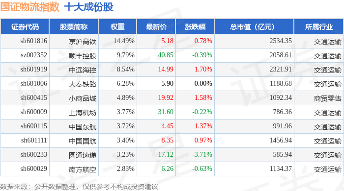 国证物流(399353)指数十大成份股详情如下: