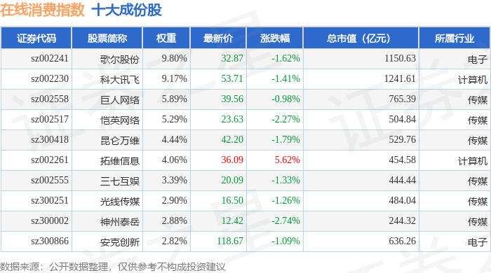 在线消费(399361)指数十大成份股详情如下: