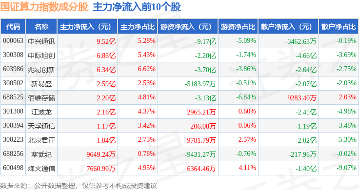 资金流向方面,国证算力(399363)指数成份股当日主力资金净流出合计4.55亿元,游资资金净流入合计3.79亿元,散户资金净流入合计7619.03万元。成份股资金流向详情见下表: