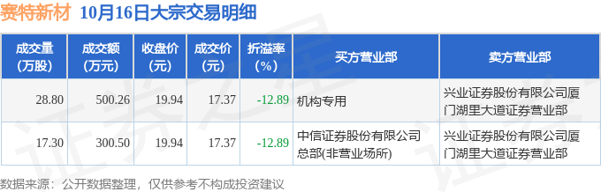证券之星消息,10月16日赛特新材发生大宗交易,交易数据如下: