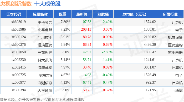 证券之星消息,10月16日,央视创新(399551)指数报收于10356.91点,跌0.49%,成交734.32亿元,换手率1.84%。当日该指数成份股中,上涨的有16家,信立泰以3.09%的涨幅领涨,下跌的有31家,强力新材以3.53%的跌幅领跌。