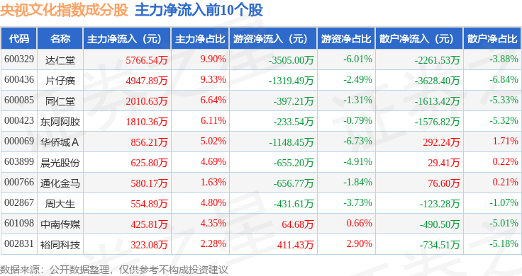 资金流向方面,央视文化(399557)指数成份股当日主力资金净流出合计25.87亿元,游资资金净流入合计4.52亿元,散户资金净流入合计21.35亿元。成份股资金流向详情见下表: