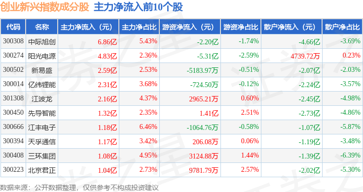 资金流向方面,创业新兴(399643)指数成份股当日主力资金净流出合计39.96亿元,游资资金净流入合计20.86亿元,散户资金净流入合计19.11亿元。成份股资金流向详情见下表: