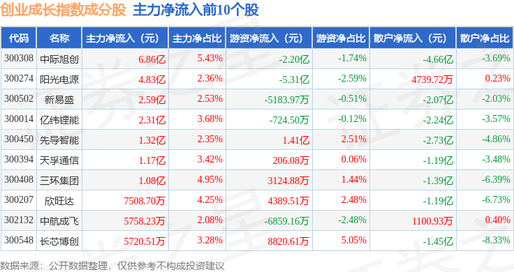 资金流向方面,创业成长(399667)指数成份股当日主力资金净流出合计20.24亿元,游资资金净流入合计10.97亿元,散户资金净流入合计9.27亿元。成份股资金流向详情见下表:
