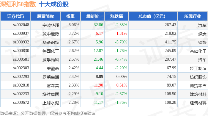 证券之星消息,10月16日,深红利50(399672)指数报收于4178.19点,跌0.68%,成交139.8亿元,换手率1.5%。当日该指数成份股中,上涨的有17家,天威视讯以3.2%的涨幅领涨,下跌的有32家,华菱钢铁以5.7%的跌幅领跌。