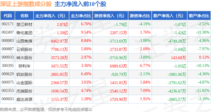 资金流向方面,深证上游(399704)指数成份股当日主力资金净流出合计32.77亿元,游资资金净流入合计5.51亿元,散户资金净流入合计27.25亿元。成份股资金流向详情见下表: