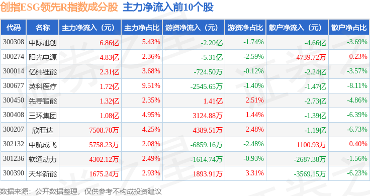 资金流向方面,创指ESG领先R(470031)指数成份股当日主力资金净流出合计15.61亿元,游资资金净流入合计7.51亿元,散户资金净流入合计8.09亿元。成份股资金流向详情见下表: