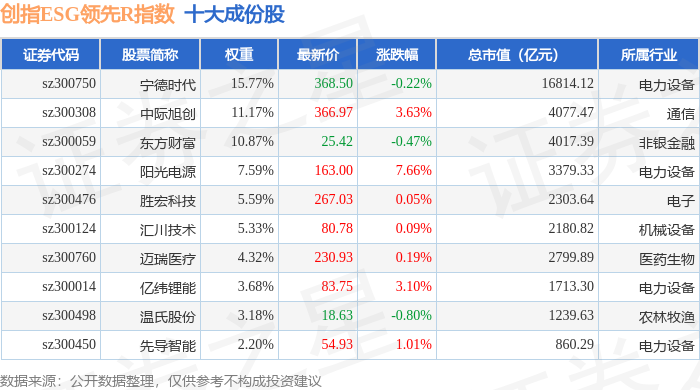 创指ESG领先R(470031)指数十大成份股详情如下: