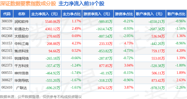 资金流向方面,深证数据要素(970053)指数成份股当日主力资金净流出合计23.75亿元,游资资金净流入合计10.69亿元,散户资金净流入合计13.07亿元。成份股资金流向详情见下表: