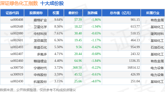 证券之星消息,10月16日,深证绿色化工(970076)指数报收于1552.3点,跌1.33%,成交363.4亿元,换手率1.69%。当日该指数成份股中,上涨的有9家,兴齐眼药以2.92%的涨幅领涨,下跌的有39家,富临精工以5.12%的跌幅领跌。