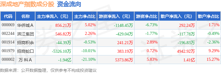 资金流向方面,深成地产(971001)指数成份股当日主力资金净流出合计2.34亿元,游资资金净流入合计4420.77万元,散户资金净流入合计1.9亿元。成份股资金流向详情见下表: