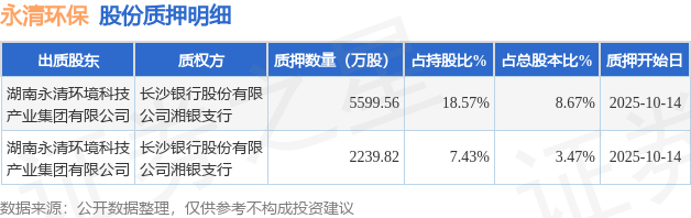 证券之星消息,永清环保(300187)10月16日公开信息显示,股东湖南永清环境科技产业集团有限公司向长沙银行股份有限公司湘银支行合计质押7839.38万股,占总股本12.14%。质押详情见下表: