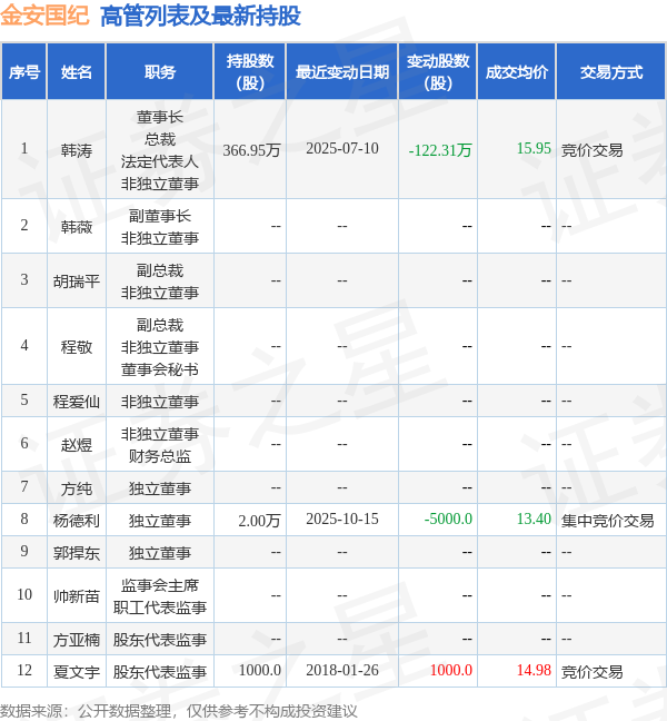 金安国纪近半年内的董监高及核心技术人员增减持详情如下:
