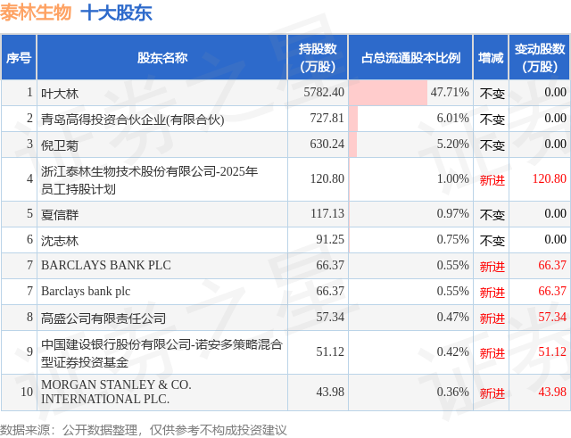 根据泰林生物2025年中报公布的十大股东详情如下: