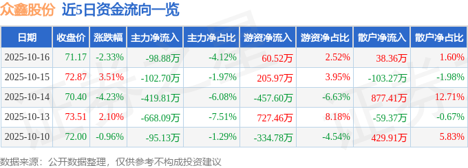 证券之星消息,截至2025年10月16日收盘,众鑫股份(603091)报收于71.17元,下跌2.33%,换手率1.08%,成交量3332.0手,成交额2398.19万元。