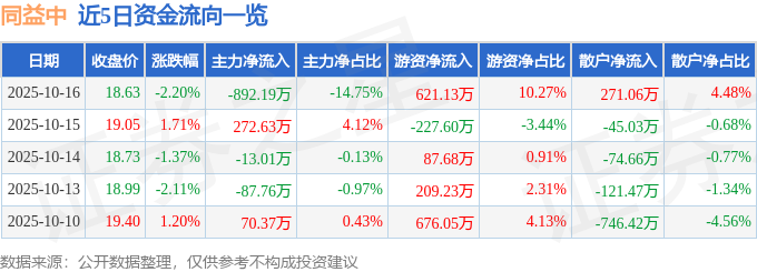 10月16日的资金流向数据方面,主力资金净流出892.19万元,占总成交额14.75%,游资资金净流入621.13万元,占总成交额10.27%,散户资金净流入271.06万元,占总成交额4.48%。