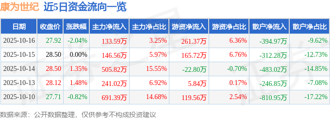 证券之星消息,截至2025年10月16日收盘,康为世纪(688426)报收于27.92元,下跌2.04%,换手率3.83%,成交量1.45万手,成交额4106.67万元。