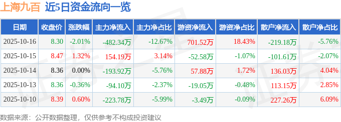 证券之星消息,截至2025年10月16日收盘,上海九百(600838)报收于8.3元,下跌2.01%,换手率1.14%,成交量4.55万手,成交额3807.26万元。