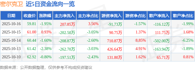 证券之星消息,截至2025年10月16日收盘,密尔克卫(603713)报收于59.81元,下跌1.95%,换手率0.61%,成交量9676.0手,成交额5840.34万元。