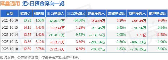 证券之星消息,截至2025年10月16日收盘,隆鑫通用(603766)报收于13.93元,下跌1.55%,换手率1.56%,成交量32.05万手,成交额4.49亿元。