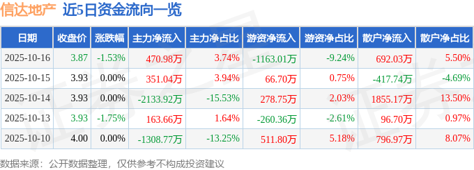 证券之星消息,截至2025年10月16日收盘,信达地产(600657)报收于3.87元,下跌1.53%,换手率1.14%,成交量32.43万手,成交额1.26亿元。