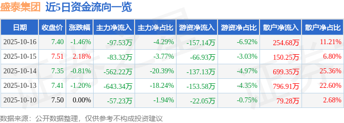 证券之星消息,截至2025年10月16日收盘,盛泰集团(605138)报收于7.4元,下跌1.46%,换手率0.55%,成交量3.05万手,成交额2272.41万元。