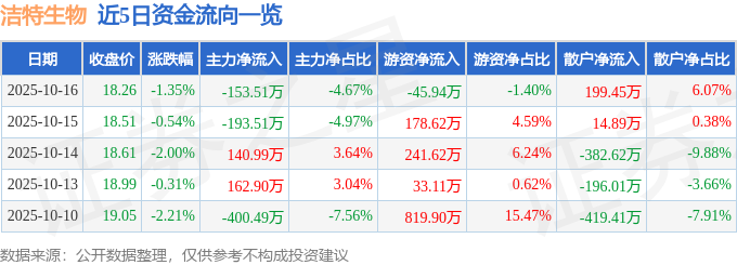 证券之星消息,截至2025年10月16日收盘,洁特生物(688026)报收于18.26元,下跌1.35%,换手率1.27%,成交量1.79万手,成交额3284.13万元。