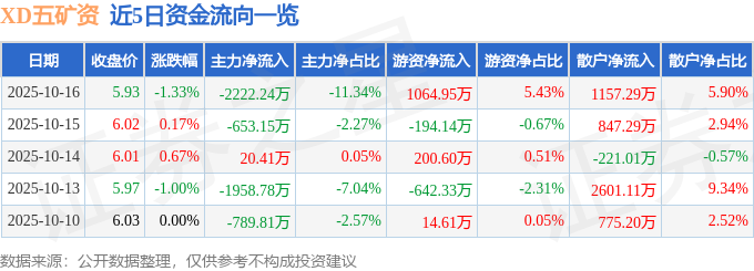 证券之星消息,截至2025年10月16日收盘,XD五矿资(600390)报收于5.93元,下跌1.33%,换手率0.73%,成交量32.93万手,成交额1.96亿元。