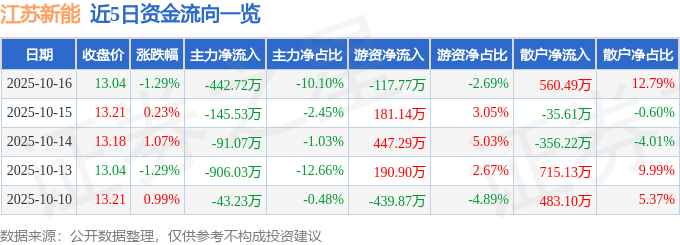 证券之星消息,截至2025年10月16日收盘,江苏新能(603693)报收于13.04元,下跌1.29%,换手率0.38%,成交量3.35万手,成交额4381.67万元。