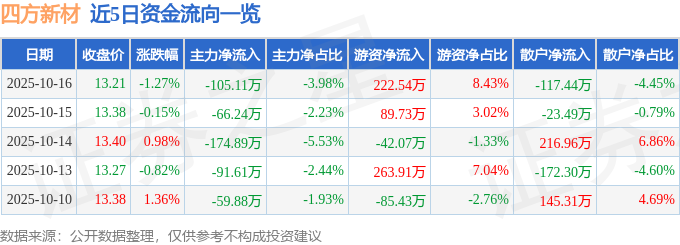 10月16日的资金流向数据方面,主力资金净流出105.11万元,占总成交额3.98%,游资资金净流入222.54万元,占总成交额8.43%,散户资金净流出117.44万元,占总成交额4.45%。