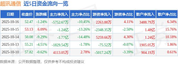 证券之星消息,截至2025年10月16日收盘,超讯通信(603322)报收于52.47元,下跌1.24%,换手率6.63%,成交量10.45万手,成交额5.5亿元。