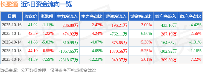 10月16日的资金流向数据方面,主力资金净流入236.89万元,占总成交额2.42%,游资资金净流入196.21万元,占总成交额2.0%,散户资金净流出433.1万元,占总成交额4.42%。