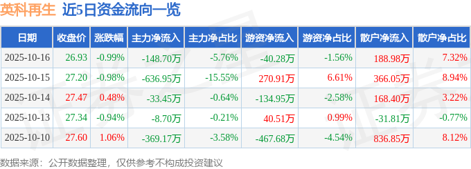 证券之星消息,截至2025年10月16日收盘,英科再生(688087)报收于26.93元,下跌0.99%,换手率0.51%,成交量9560.0手,成交额2581.74万元。