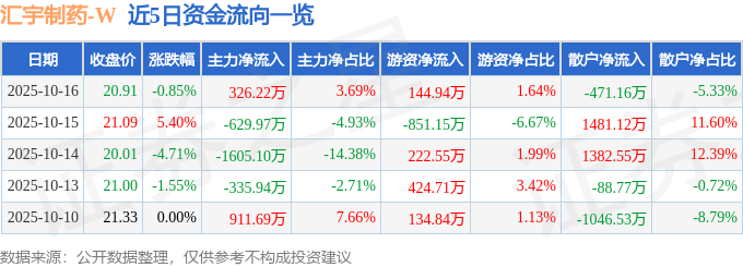 证券之星消息,截至2025年10月16日收盘,汇宇制药(688553)报收于20.91元,下跌0.85%,换手率1.22%,成交量4.18万手,成交额8839.25万元。