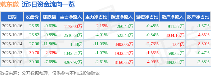 证券之星消息,截至2025年10月16日收盘,燕东微(688172)报收于26.65元,下跌0.63%,换手率3.42%,成交量19.99万手,成交额5.44亿元。