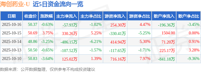 证券之星消息,截至2025年10月16日收盘,海创药业(688302)报收于50.37元,下跌0.63%,换手率1.13%,成交量1.12万手,成交额5692.09万元。