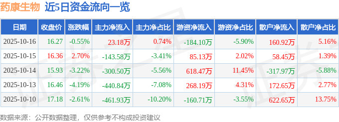 证券之星消息,截至2025年10月16日收盘,药康生物(688046)报收于16.27元,下跌0.55%,换手率0.46%,成交量1.9万手,成交额3119.5万元。