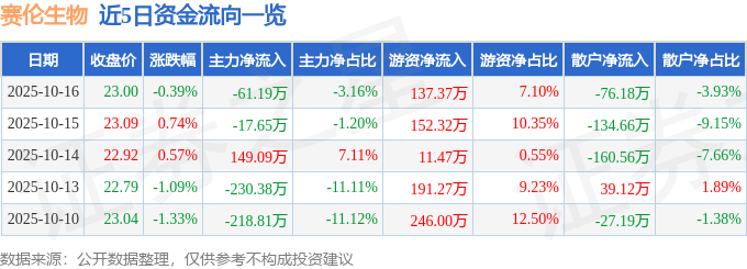 证券之星消息,截至2025年10月16日收盘,赛伦生物(688163)报收于23.0元,下跌0.39%,换手率0.77%,成交量8380.0手,成交额1936.12万元。