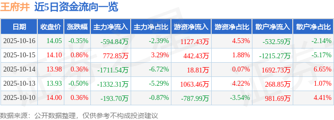证券之星消息,截至2025年10月16日收盘,王府井(600859)报收于14.05元,下跌0.35%,换手率1.57%,成交量17.65万手,成交额2.49亿元。
