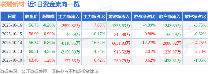 证券之星消息,截至2025年10月16日收盘,联瑞新材(688300)报收于56.75元,下跌0.26%,换手率2.36%,成交量5.71万手,成交额3.31亿元。
