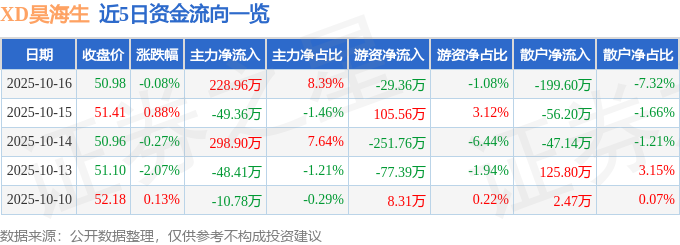 证券之星消息,截至2025年10月16日收盘,XD昊海生(688366)报收于50.98元,下跌0.08%,换手率0.27%,成交量5335.0手,成交额2727.46万元。