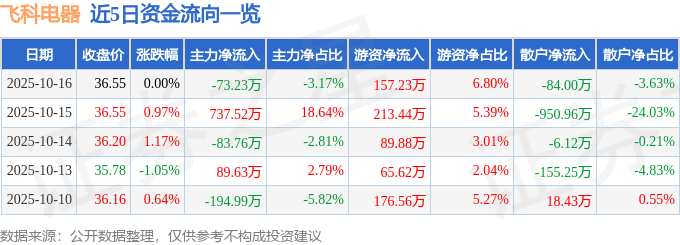 证券之星消息,截至2025年10月16日收盘,飞科电器(603868)报收于36.55元,上涨0.0%,换手率0.15%,成交量6326.0手,成交额2311.15万元。
