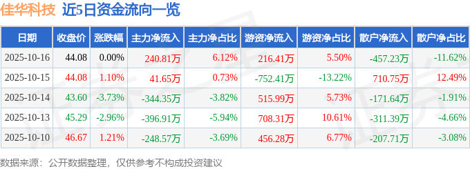 10月16日的资金流向数据方面,主力资金净流入240.81万元,占总成交额6.12%,游资资金净流入216.41万元,占总成交额5.5%,散户资金净流出457.23万元,占总成交额11.62%。