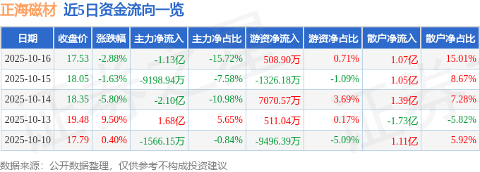 证券之星消息,截至2025年10月16日收盘,正海磁材(300224)报收于17.53元,下跌2.88%,换手率4.39%,成交量40.62万手,成交额7.16亿元。