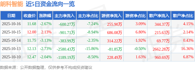证券之星消息,截至2025年10月16日收盘,朗科智能(300543)报收于11.68元,下跌2.67%,换手率2.82%,成交量7.05万手,成交额8292.84万元。