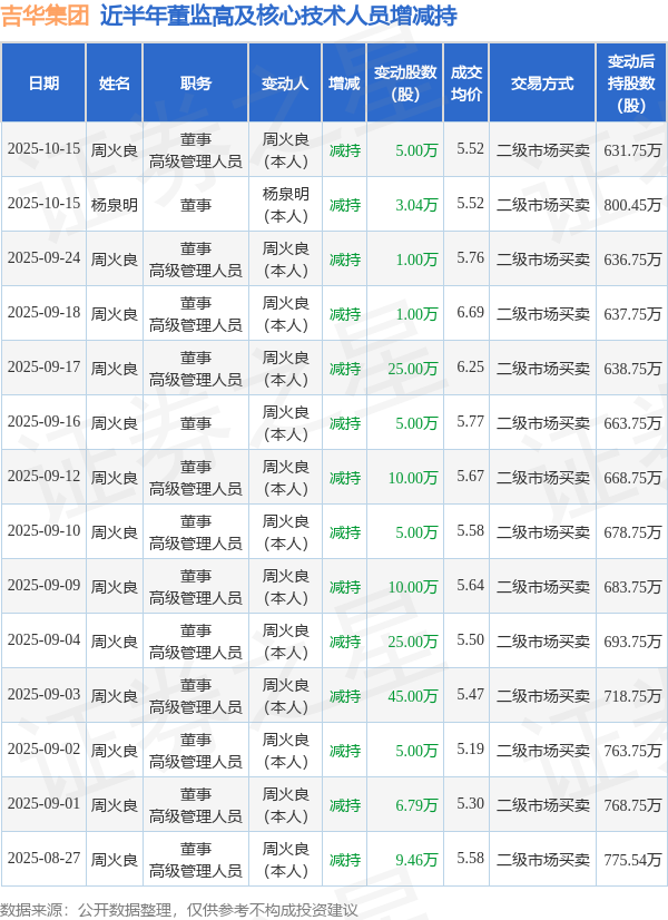 吉华集团近半年内的董监高及核心技术人员增减持详情如下: